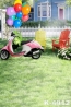 Colorful Balloons Tied to Motorcycle Chairs in Yard Photo Drop Background